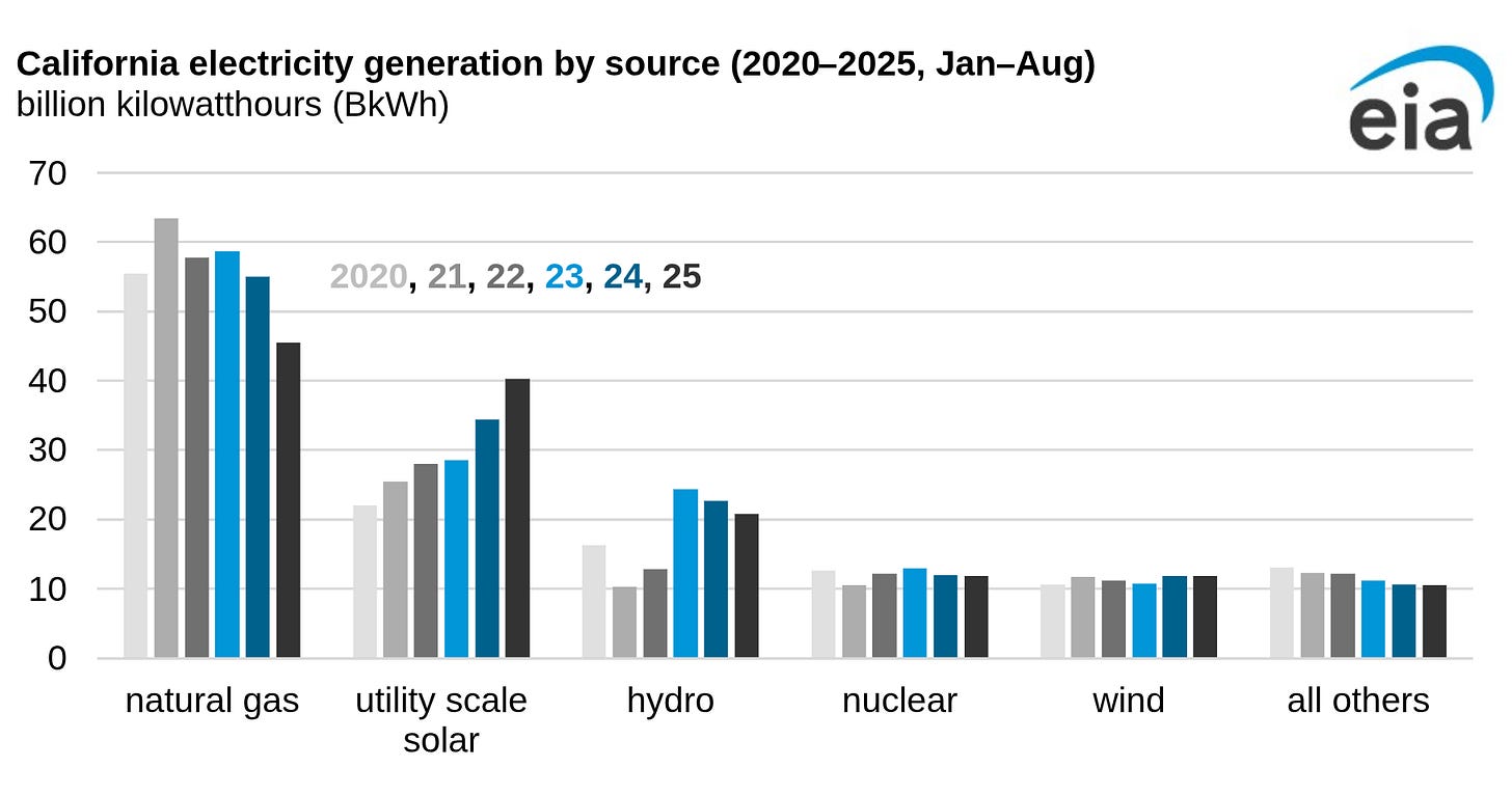 During drought or just low water years, Natural Gas has to ramp up to take up the missing load for Hydro power; and since battery storage for large scale solar power does not exist in the US; natural gas generation has to fire up to keep the grid operation when solar does not work: at night. Wind is about the same as nuclear, which is declining. It is worth noting that “Mr. Solar” intervened to keep Diablo Canyon Nuclear power plant going until he’s out of office. It remains the only nuclear power plant in operation in California. Which puts the Wind power in perspective – that source is the same as one nuclear power plant.